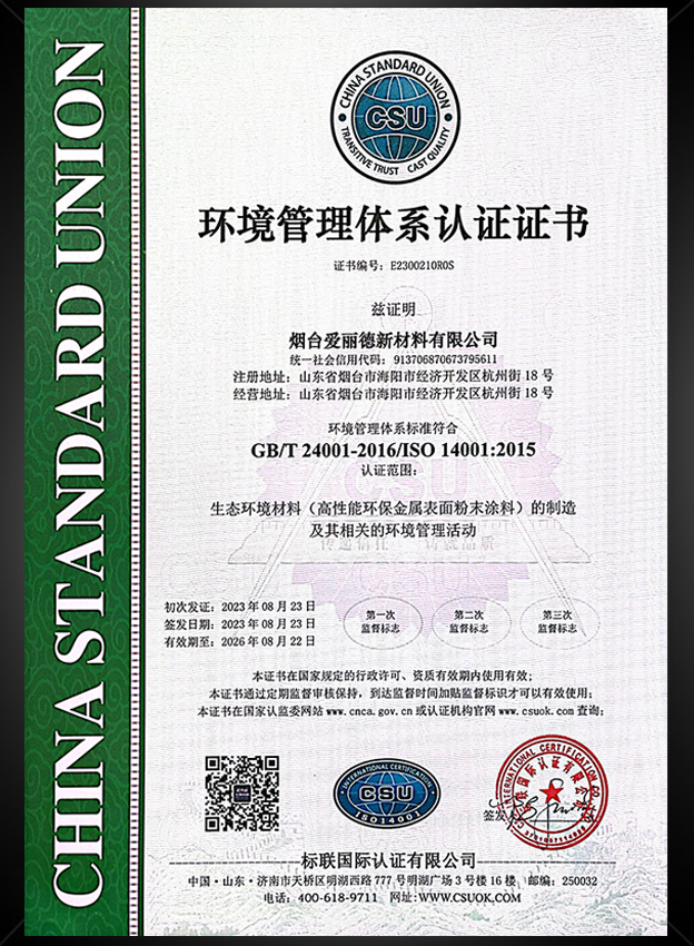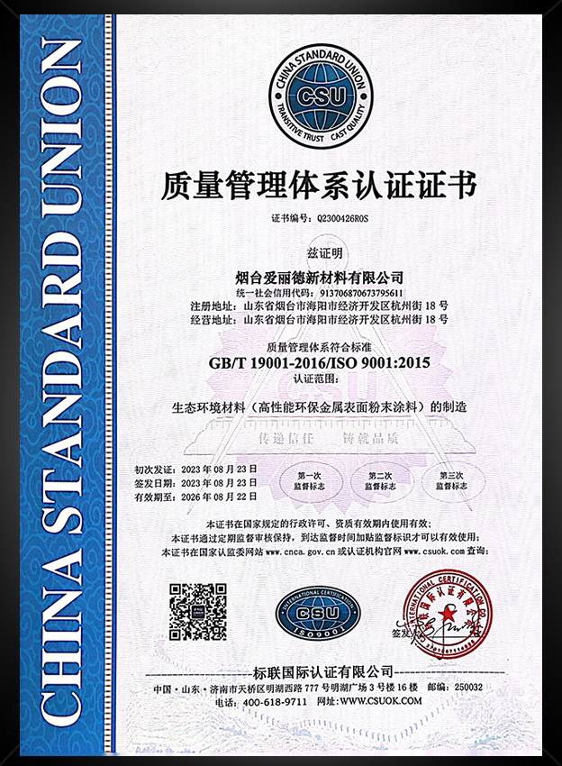 并且已經通過了Qualicoat-Ⅰ類粉的產品認證;通過Qualicoat-Ⅱ類粉的產品認證;Qualicoat-Ⅲ類粉產品認證正在進行中。